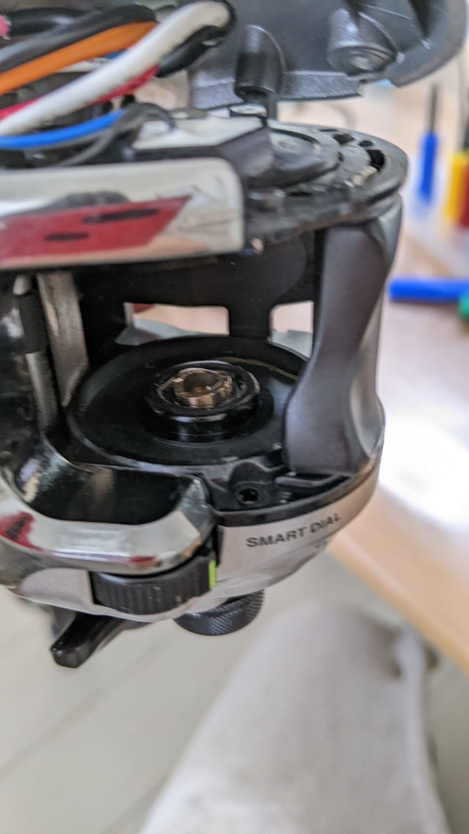 ルアーのベイトリールと違って、スプールを外すことにも一手間が必要。サイドプレート側から見えているビスと、内側の黒い部分に見えるビスを器用に外していく必要がある。
