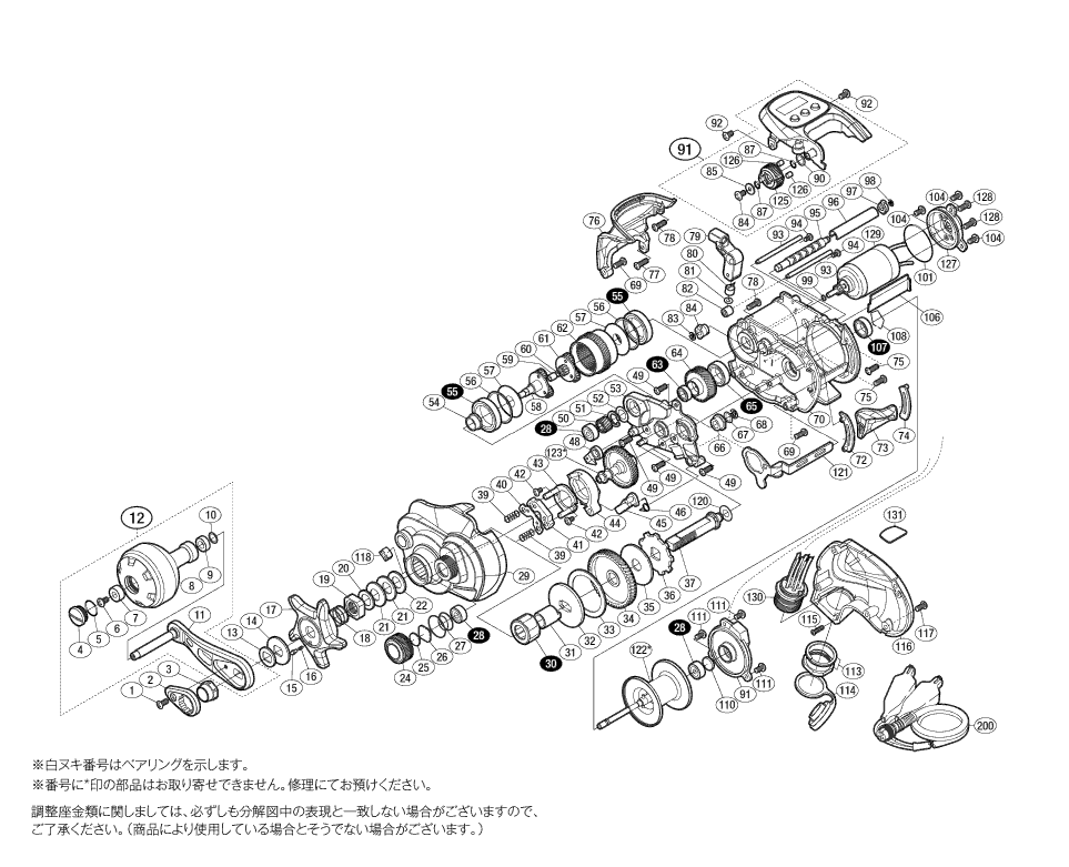 スプールに手が届いた時点で、軸を持って手で回してみると、スプール単体の回転の重さに気づく。ハンドルが重いという症状であったが、実はハンドル~ギヤ組までは問題なく、スプールとそれを挟むベアリングの回転に問題があることが分かった。